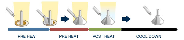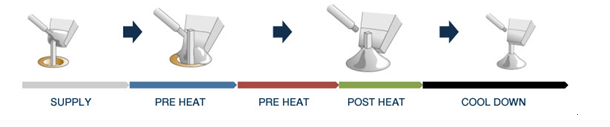 激光焊錫和機(jī)器人烙鐵焊錫的工序都是分為進(jìn)行“預(yù)熱”、為提供焊錫時(shí)的“加熱”和提供焊錫后成型時(shí)的“后加熱”3個(gè)基本步驟。雖然機(jī)器人烙鐵焊錫和激光焊錫的基本工序相同,但提供加熱焊錫的方法不同。理解這點(diǎn)至關(guān)重要。(下圖所示)